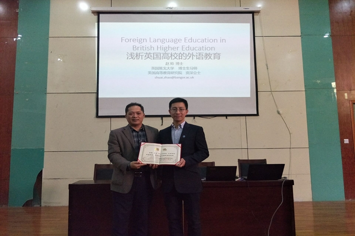 11月7日下午,英国班戈大学博士赵帅应我校外国语学院之邀,在经管学院1113报告厅作了题为《浅析英国高校的外语教育》的专题报告。该院院长赵昉、副院长郑忠耀、副书记李惠敏和该院全体教职工及部分研究生聆听了此次报告。报告会由郑忠耀主持。