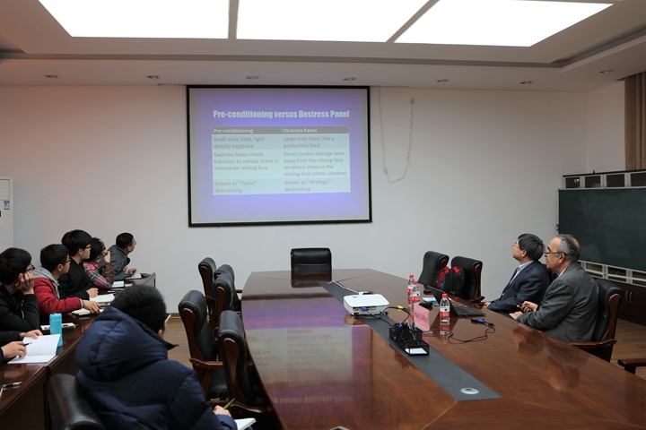 报告会上,哈尼·米特里首先就爆破卸压的定义及相关理论知识进行了讲述,并对卸压爆破效果和本构模型进行了深入的讲解。随后,他强调了卸压爆破对减轻采动围岩应力集中的重要性,结合具体实例介绍了卸压爆破在采掘工程岩爆控制等的应用,并详细讲解了卸压爆破准则及其今后的发展方向。在交流环节中,哈尼·米特里与现场师生进行了深入的互动和讨论,并就师生们提出的疑问进行了耐心细致的解答。最后,报告会在师生们阵阵热烈的掌声中落下帷幕。会后,大家一致认为,通过聆听报告,有助于开阔学术视野,对专业方向的前沿发展有更深层次的了解和认知。