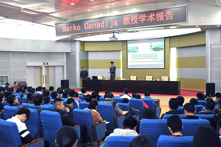 聘任仪式结束后,马科·卡那迪加作了题为《固体热力学:实验观测和数值计算》的学术报告。报告会上,他首先讲述了温度变化对材料变化的影响,并以镁合金为例,通过热效应理论、物理性质的外温比较,借助实验数据对比,显示了其随时间延长、温度不同的变化。马科·卡那迪加表示,在研究过程中,他发现材料的热消散与材料变化起始点有关,并经过进一步研究后得出了不同凝固速度对材料热效应的影响。随后在数据分析上,他提出了红外照射方法,并指出以此可有效提高实验精度。最后他阐述了微观研究与宏观研究的关系:通过宏观可以研究微观本质,研究微观是为了服务预测宏观。报告会后,马科·卡那迪加回答了在场师生提出的问题。