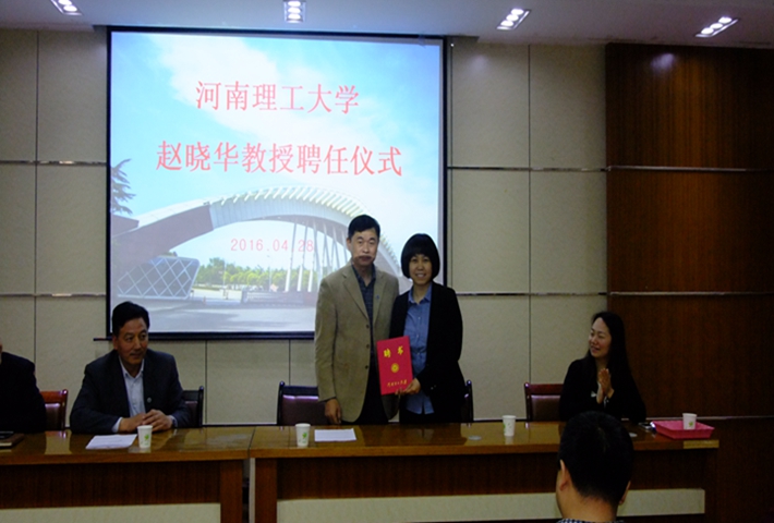 4月28日,北京工业大学教授赵晓华受聘为我校特聘教授。聘任仪式在能源学院201会议室举行。副校长赵俊伟出席授聘仪式并为赵晓华颁发特聘教授聘书,人事处处长郭健卿,能源学院党委书记王婕、院长郭文兵参加仪式。仪式由郭文兵主持。