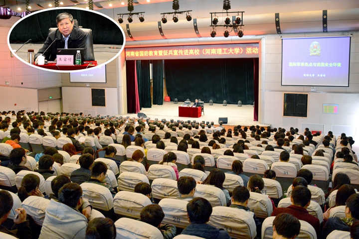 3月24日,河南省国防教育暨征兵宣传进高校活动走进我校,国防大学教授王宝付在小礼堂举办了题为《当前国际军事热点与我国安全环境》的国防教育讲座。千余名师生聆听了此次讲座。