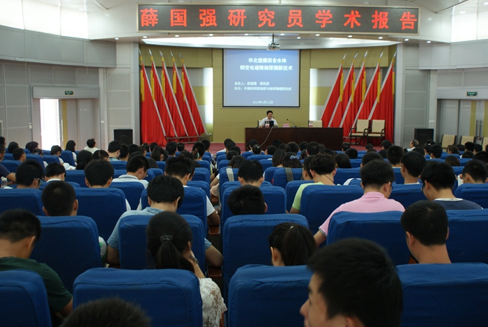 报告会上,薛国强介绍了研究所的发展概况及个人发展经历,并鼓励在校学生勤奋努力,踏实学习。接着,讲解了瞬变电磁勘探基本情况,说明了该项技术的仪器设备的使用方法,并结合当前国际前沿研究动态,分析今后工作需要关注的问题。薛国强的报告内容丰富、重点突出,紧密结合当前热点问题,他热情洋溢的演讲赢得了同学们的阵阵掌声。