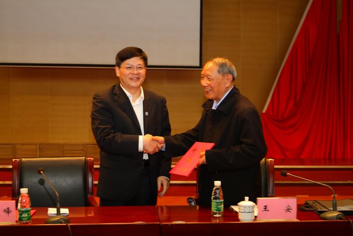 在报告会开始之前,校长邹友峰分别为王安少将与王声湧教授颁发了兼职教授聘书并合影留念。