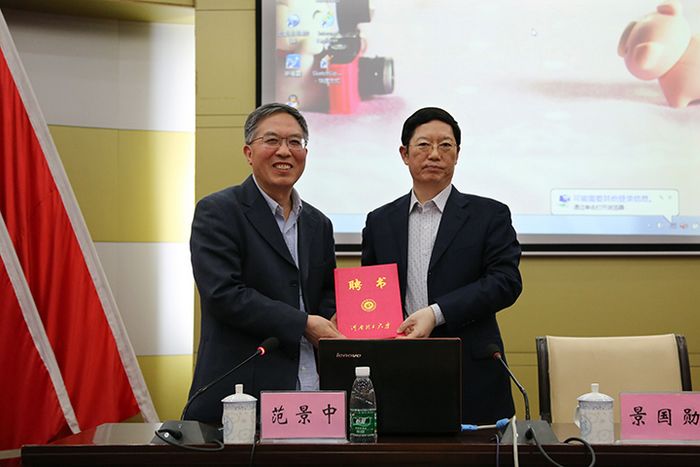 3月28日晚,中国美术学院教授、南京师范大学美术学院特聘教授、博士生导师范景中应邀来校,在圆形报告厅作了“艺术漫谈”的学术报告。副校长景国勋参加报告会,并为范景中教授颁发河南理工大学兼职教授聘书。我校三百余名师生聆听了此次报告会。报告会由建筑与艺术设计学院院长陈兴义主持。