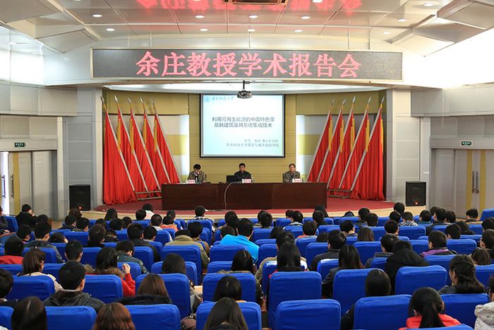 余庄就利用可再生能源的中国特色零能耗建筑及其系统集中技术进行了深入的探讨,以他主持的华中科技大学建筑与城市规划学院教学楼的改建为示范,以可再生能源的利用为中心,从墙体保温、地下能量利用、能量存储、窗体构造、空气净化等内容进行了详细的讲解,提出零能耗—可再生能源的效率—系统集成理念,并通过大量的工程实地照片、图像及各种统计数据阐述了土壤冷热源技术、风能系统及太阳能建筑一体化技术和智能控制系统的利用,实现节能节地节水节材“四节一环保”的目标,建造舒适的建筑空间,体现建筑学以人为本的建筑理念。整场报告内容详实,余庄教授深入浅出的讲解、精彩叠加的分析,引起在场师生的极大兴趣。在互动环节,余庄教授与师生进行了充分的交流,耐心地解答了同学们的问题。