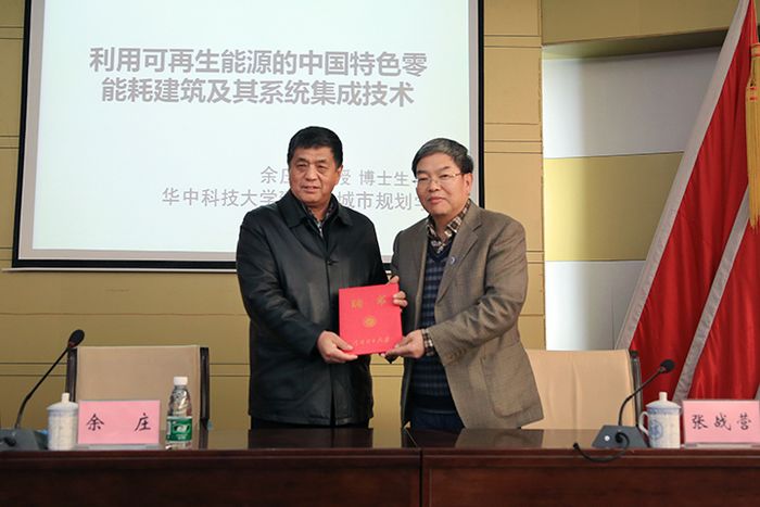 12月4日下午,华中科技大学余庄教授应建筑与艺术设计学院邀请,在圆形报告厅作了一场题为“利用可再生能源的中国特色零能耗建筑及其系统集成技术”的学术报告,并受聘为学校兼职教授。副校长张战营为余庄教授颁发了河南理工大学兼职教授聘书。百余名师生聆听了此次报告会。该院院长陈兴义主持了此次报告会。