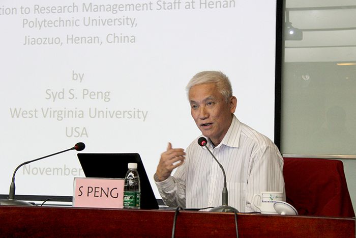 11月4日下午,我校邀请美国工程院院士彭赐灯在我校南校区明德楼会议室作了一场题为“Research Administration in US Higher Institutions(美国大学科研管理) ”的报告。河南省教育厅科研经费专项检查工作组专家、校长邹友峰、副校长周英出席报告会,科技处、社科处、财务处、审计处等相关职能部门负责同志、学院(科研)负责人和科研秘书共同听取了报告。报告会由科技处处长张国成主持。