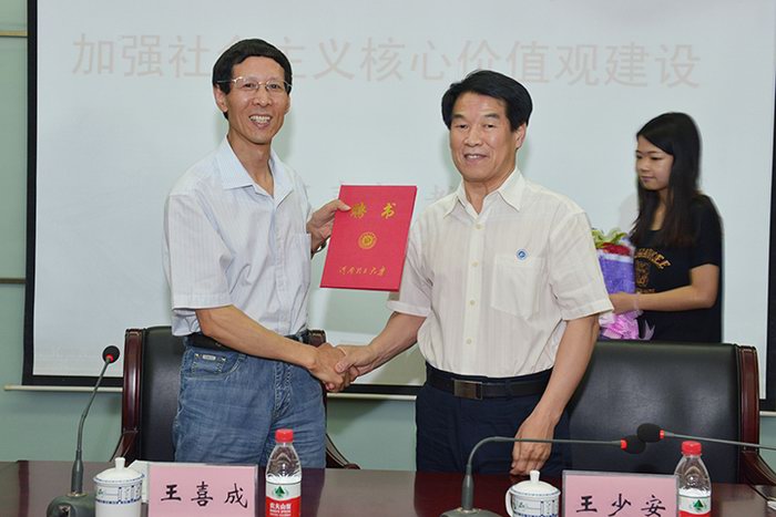 报告会开始之前,举行了兼职教授聘任仪式,校党委书记王少安为王喜成颁发了聘书。