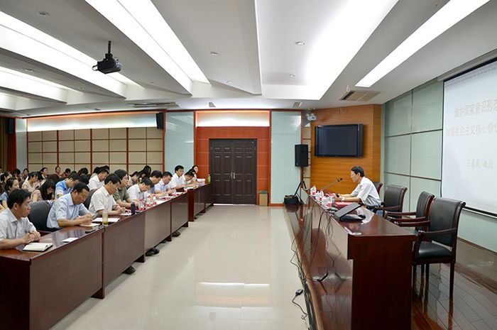 6月4日下午,应马克思主义学院之邀,河南省社科联副主席王喜成教授在明德楼会议室作了一场题为“关于维护国家意识形态安全,加强社会主义核心价值观建设”的学术报告。校党委书记王少安、校党委副书记兼纪委书记张国臣、校党委职能部门部分工作人员、马克思主义学院全体教师和研究生聆听了报告会。报告会由张国臣主持。