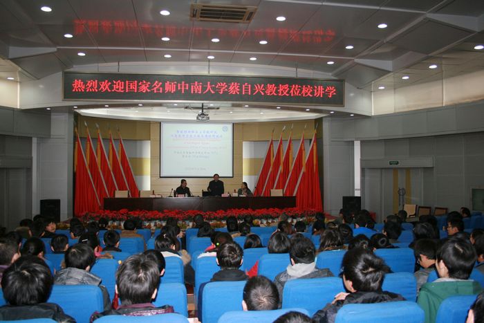 报告会上,蔡自兴首先向大家展示了自己十年来所主持的国家级科研项目中的优秀成果。紧接着,蔡自兴又围绕异质体多移动体的体系结构、协同机制、协作环境感知与目标跟踪三个方面向大家介绍了国家国防基础研究项目“异质多移动体的协同侦察与重构技术的基础研究”。随后,蔡自兴就如何进行智能科学技术精品课程群建设做了详细介绍,提出了以建立精品课程群为核心、以课堂教育为基础、以实训深化教学成果的课堂教学与实践教学相结合的创新体系。最后,蔡自兴与现场的师生进行了热烈的交流。