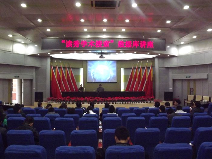 11月22日下午,我校图书馆根据文献资源利用培训计划,特邀北京超星数图信息技术有限公司培训专员高阳,在圆形报告厅作了一场题为《“读秀学术搜索”在教学科研中的应用》的讲座。我校师生百余人听取了此次讲座,图书馆副馆长曾玉凤主持讲座。