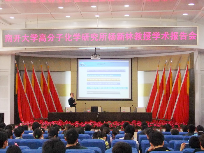 4月25日上午,南开大学高分子化学研究所杨新林教授在我校学术报告厅,为我校材料学院师生作了一场关于《蒸馏沉淀聚合法合成聚合物微球及其应用性能的研究》的学术报告。会议由该院副院长张传祥主持,该院高分子系教师和材料专业部分同学参加了此次报告会。
