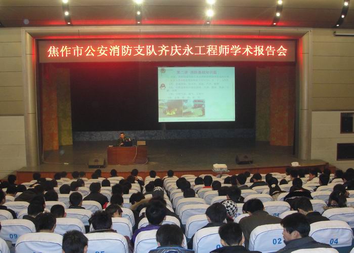 11月27日上午,焦作市公安消防支队齐庆永警官应邀于我校小礼堂作了一场题为《齐心剿火患,安全伴你行》的精彩报告。我校800余名师生一同聆听了此次报告。