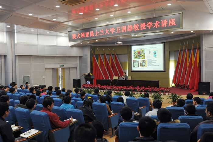 报告会上,王国雄教授首先简单介绍了昆士兰大学概况及其在清洁能源方面的研究成果。接着,他从两国友谊、地区合作优势等方面详细地说明了BAJC-Joint R&D Centre with Baosteel(宝钢-澳大利亚联合研发中心)成立对中澳两国的重要意义。随后,他向大家具体阐述了未来五十年人类将面临的能源、水、食品等十大问题,其中他突出强调了能源问题并指出清洁能源的研究与开发是社会发展的必然趋势。然后他从发电系统、清洁煤研究等四个方面着手,重点介绍了昆士兰大学在膜分离技术、纳米级CO2吸附剂和有关煤层气开采相关基础研究等领域的最新研究进展,并鼓励同学们要有创新意识,努力学习,为推动清洁能源发展奠定基础。在会后的互动环节,王国雄教授还对同学们提出的能源研究方向、煤气层开采等问题作了详细解答。