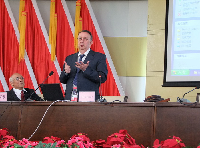 报告会由俄罗斯自然科学院院士、我校教授牛济泰主持,他对Brnic Josip教授一行到访表示欢迎,并向大家简要介绍了Brnic教授访问交流行程及两校科研合作背景。随后,Brnic教授在舒缓的音乐中首先通过图片影像向大家介绍了克罗地亚的历史、人文、地理环境,里耶卡大学的教学科研条件和人才培养制度,以及克罗地亚教育体系,优美意境引人入胜。在学术讲座阶段,Brnic教授围绕有限元法在桥梁剪切破坏研究中的应用和马氏体不锈钢在高低温环境中蠕变断裂行为等问题展开深刻论述,他运用以拉普拉斯方程和泊松方程等为基础的运算方法详解了他在金属力学领域内的最新研究成果,给我校科研人员以交流借鉴。Brnic教授温和儒雅的授课风格和严谨、创新的学术态度使在场师生深受感染。