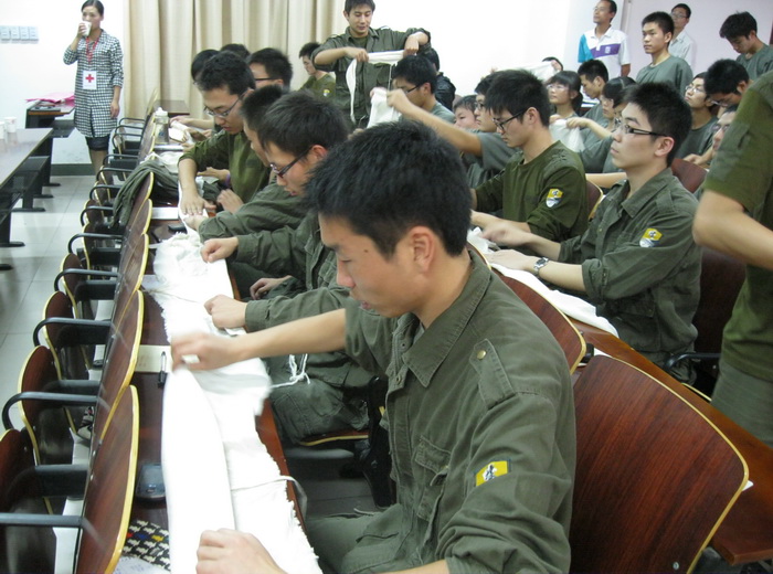 红十字会老师为应急救援队队员进行急救包扎培训