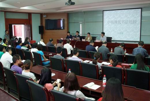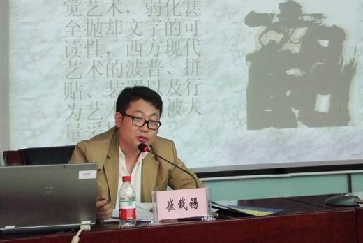 为进一步促进中韩文化之间的交流,加快我校建筑与艺术设计学院艺术类学科的发展,5月25号下午, 2011年度第四期建筑与艺术设计博士论坛在我校明德楼一楼会议室召开,韩国青年书法家崔载锡博士应邀作了一场题为《中韩现代书法比较研究》的学术报告。中国书法艺术家协会会员、焦作市书法家协会主席张生赋,中国书法家协会会员、河南省书法家协会副主席、焦作市书法家协会副主席米闹,中国书法家协会会员、焦作市书法家协会副主席岳建平、李志强,中国书法家协会会员、焦作市书法家协会副秘书长毋立,建筑与艺术设计学院特聘教授陆长德、刘庆孝,该院党委书记张志军等与广大师生共同聆听了此次报告会。崔博士在报告伊始捐赠了作品,该院院长陈兴义教授为其颁发了收藏证书,并回赠了纪念品。报告会由该院副院长王同文主持。