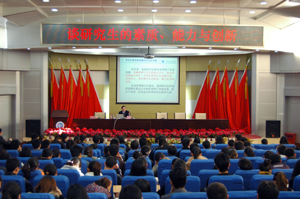 报告会上,副校长景国勋首先介绍了《国家中长期教育和发展规划纲要》中有关研究生教育的主要内容,说明了素质教育是培养杰出人才的基础。接着,针对我国研究生教育基本概况及存在问题,景国勋指出,我国研究生的培养规模在近几年得到快速发展,但是研究生也存在着理论基础不够扎实、知识面过于狭窄,只注重知识积累而忽视知识创新,缺乏实践能力,科研能力不强,学术道德失范等问题。因此在研究生扩招的形势下,必须大力加强研究生素质、能力及创新精神的培养。