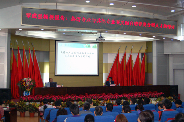 报告会上,覃成强教授指出在经济科技迅速发展的形势下我国高校英语教学面临的问题与挑战,即三个“不适应”:其一,传统的高校英语专业培养模式一成不变,培养规格单一,课程设置不合理,导致学生只注重掌握英语技能,而忽视多元化知识的学习,以致学生初入岗位表现出诸多的不适应。他强调应该把传统的“经院式”人才培养模式转变成宽口径、应用型、复合型人才的培养模式。其二,英语专业教学没有突破传统的应试型、哑巴式的教学模式的瓶颈,以致学生不能很好地灵活运用所学的知识自由地表达思想,英语实际应用能力不高。其三,学校没有形成良好的英语学习环境,无法达到语言与文化的真正融合,难以切实提高学生进行跨文化交际的能力。面对诸多挑战,他认为培养复合型人才极其必要,要改革指导思想以适应市场需求,变不适应为适应,使学生主动适应社会。紧接着覃成强就外语专业教育改革与发展提出了专业技能教学素质化、专业知识教学启发性、复合型课程设置相关专业系统化、通用性人才培养知识广博化四原则,阐述了复合型人才培养所遵循能力本位原则、就业导向原则、质量第一原则和学科交叉与融合原则,介绍了引进和借鉴国外先进教学理念、采用沉浸式教学、楔合式的学科交叉与融合的人才培养模式,提出要不断转变教育思想理念,改革教学方法与教学手段,创新教学评估方法和手段。最后覃成强教授总结要转变观念打破传统教学方法束缚,引进国外教育资源,遵循传统与现代结合、国际化与本土化相结合、在保持英语优势的前提下与其他学科相结合的理念,培养出符合社会市场需要的高水平的复合型人才。