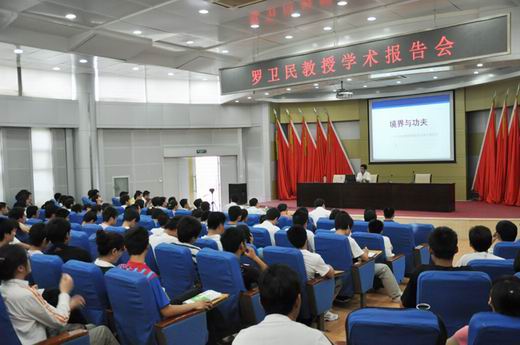 报告会上,罗卫民首先从普遍理解和自我感悟两方面阐释了“哲学是什么”的问题。他认为,哲学是一门研究精神追求的学问,是一种纯粹的思考。接着,罗卫民从小球“竖直上抛”的物理模型的角度解释了武术中“太极”、“无极”的含义,从而进一步阐述了王宗岳“无极而生,动静之机,阴阳之母,动之则分、静之则合”的观点。随后,罗卫民分析了太极拳理论产生的历史文化背景,并结合中国哲学最高本体概念的发展,介绍了太极一词在中国哲学史上的地位,即太极是中国哲学本体论最根本的理念。最后,罗卫民在详细阐述“太极拳的太极是什么”的同时,从天人合一、知行合一和太极拳三个角度向在场师生揭示了太极概念和太极拳理论在哲学上的关系。他指出,从宏观角度而言,整个中国哲学的思想可以简单的归纳为境界与功夫两大要点。