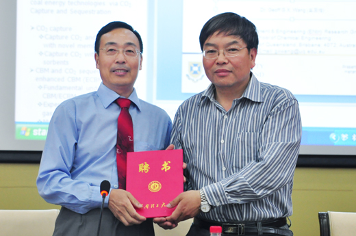 报告会伊始,副校长张战营向王国雄颁发了兼职教授聘书,并致以诚挚的祝贺。他指出,王国雄学术成就突出,在国内外学术界影响广泛,他的加盟有助于加快我校洁净煤能源研究方面的发展。