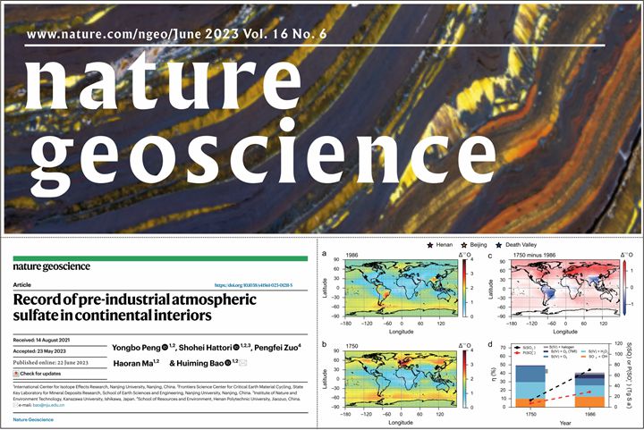 近日,我校资源环境学院青年教师左鹏飞博士与南京大学鲍惠铭、彭永波教授合作以共同作者在国际地学顶刊《自然-地球科学》(《Nature Geoscience》),发表题为《陆内工业化前大气中硫酸盐的记录》(《Record of pre-industrial atmospheric sulfate in continental interiors》)的研究成果,实现了该学院顶级学术成果的历史性突破。