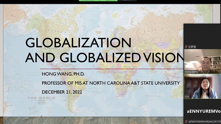 本网讯 (通讯员 仝梦莹)为培养同学们的国际化视野,12月21日上午,工商管理学院邀请美国北卡罗莱纳农工州立大学教授王红为工商管理3个实验班同学作“国际化视野与国际化教育”报告。实验班副班主任以及实验班全体同学参会,会议由该院副院长兼22级实验班班主任傅端香主持。