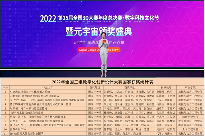 本网讯 (通讯员 代军)近日,第十五届全国三维数字化创新设计大赛(简称:全国3D大赛)年度总决赛在线上成功举办,12月17日,全国3D大赛年度总决赛颁奖盛典顺利闭幕。共来自全国31个省、市、自治区,近600所院校的参赛团队组织参赛,结合当前疫情防控形势,总决赛采用了线上直播答辩的方式进行。经过两天的激烈角逐,最终决出各参赛方向的一、二、三等奖、最佳单项奖等多个奖项,河南理工大学参赛团队表现优异并取得历届最好成绩,共斩获国家级一等奖7项、二等奖2项、三等奖2项,涉及数字工业、数字人居、元宇宙·XR创新应用大赛、3D/VR校园大使创新创业大赛等多个赛道。河南理工大学荣获优秀组织奖,获奖奖项与等级再创新高。通过此次竞赛,学子们充分展示了他们的创新能力和团队精神,响应大众创业、万众创新,积极投身数字经济和创新创业的时代洪流。