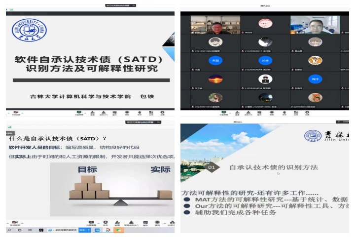 本网讯 (通讯员 王辉 赵艳花)12月8日上午,吉林大学教授包铁应邀参加计算机学院第三届研究生学术文化节,为计算机、软件学院师生线上作题为《软件自承认技术债(SATD)识别方法及可解释性研究》的学术报告,软件学院教授王辉主持报告会,部分教师和研究生参加了报告会。