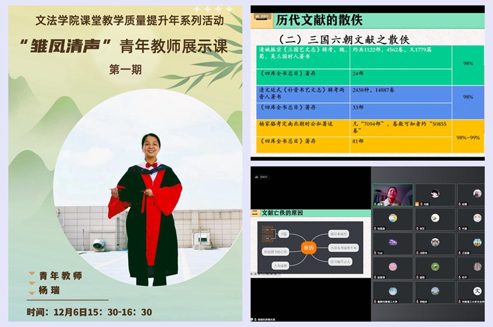 本网讯 (通讯员 刘晶)2022年为河南省本科高校课堂教学质量提升年,根据《文法学院课堂教学质量提升年专项行动工作方案》部署,12月6日下午,首期“‘雏凤清声’青年教师展示课”活动在线上举行。本次活动由该院副院长曹爽主持,新进青年教师杨瑞博士主讲,该院教学委员会成员、近三年新进青年教师参加,其他教师进行了观摩。