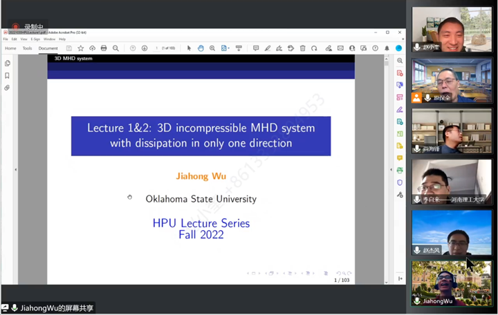 11月30日至12月4日, 数信学院特邀美国俄克拉荷马州立大学终身教授吴家宏通过线上形式为大家作了六场关于偏微分方程方向的系列讲座。系列报告由该院院长原保全主持。相关方向教师和研究生聆听了系列讲座。