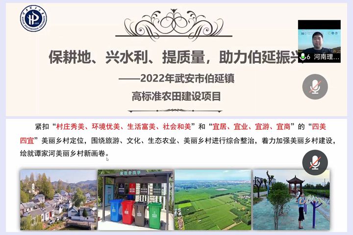 大赛自今年5月份启动以来,吸引了中国农业大学、中国地质大学、河海大学、长安大学和河南理工大学等高校参赛,最终遴选出69份作品晋级决赛。在决赛环节,由我校专业教师傅建春指导,土管系19级学生程世茂、王虎、谭佳乐组成的队伍,围绕《保耕地、兴水利、提质量,助力伯延振兴——2022年武安市伯延镇高标准农田建设项目》;由朱帅蒙、王宇共同指导,土管系20级学生刘向阳、秦璐、赵淑贤、赵钰铎组成的队伍,围绕《拥万亩良田,饮一池碧水,幸福美丽新乡村——信阳市浉河区4个村土地整治》报告内容,经线上作品汇报、专家质疑等环节的激烈角逐,最终分别荣获二等奖和三等奖。