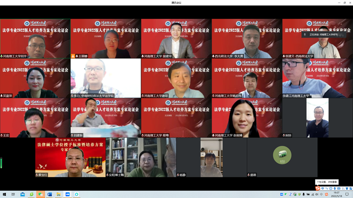 本网讯 (通讯员 何平)为更好地贯彻落实习近平法治思想和教育部《法学类教学质量国家标准(2021版)》精神,创新法治人才培养机制,提升我校法学专业办学质量和水平,5月18日晚,我校以腾讯会议方式召开2022版法学本科人才培养方案专家论证会。本次会议邀请了西南政法大学教务处处长张建文教授、西北政法大学教务处处长李大勇教授、中南财经政法大学法学院李力教授三位法学界资深专家参加。教务处、文法学相关负责人和法学系全体教师参加了会议。