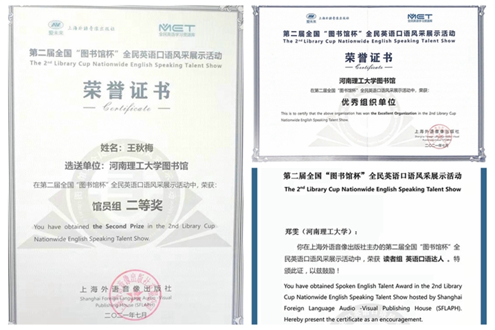 本网讯(图书馆 金建军)近期,由上海外语音像出版社主办,全国各类图书馆参与,以“百年辉煌,世界听我说!”为主题的第二届全国“图书馆杯”全民英语口语风采展示活动落下帷幕。全国共有62所图书馆荣获“优秀组织单位”称号,我校图书馆位列其中,这是继第一届获得“组织之星”后再次获此殊荣。