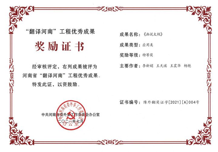 本网讯(通讯员 王天琪)近日,河南省委外事工作委员会办公室发布《中共河南省委外事工作委员会办公室关于2021年度“翻译河南”工程优秀成果征集情况的通报》(豫外委办〔2021〕33 号),我校有11件作品获奖,其中特等奖2项,二等奖3项,三等奖6项。特等奖为省级奖,一、二、三等奖为厅级奖。本次活动是省委外事工作委员会办公室在全省开展的翻译优秀成果评选活动,旨在征集和评选具有前瞻性、创新性和应用价值的“翻译河南”成果,弘扬黄河文明、中原文化,讲好河南故事,进一步加强我省在国际语言能力与国际传播能力等领域的学理研究和成果转化应用,加快构建对外话语体系,服务我省高水平开放和高质量发展的任务要求。