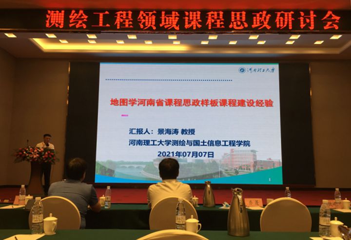 本网讯(通讯员 王磊/文 程结海/图)为贯彻落实教育部《高等学校课程思政建设指导纲要》,加强测绘及相关领域高校、企业交流合作,提升领域专业课程思政建设水平,7月7日,河南省测绘学会测绘教育与科普工作委员会在郑州举办了测绘工程领域课程思政研讨会,测绘学院院长魏峰远一行9人参加会议,地信系教授景海涛代表学校作题为《地图学河南省课程思政样板课程建设经验》的报告。