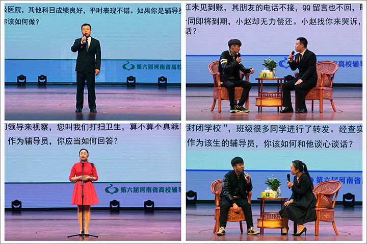 本次大赛由中共河南省委高校工委、河南省教育厅主办,周口师范学院承办,来自全省112所高校的129名辅导员参加比赛。大赛分为复赛、决赛两个阶段。复赛包括基础知识测试(含网文写作)、谈心谈话、主题班会3个环节,成绩排名前30名选手进入决赛,凭借扎实的专业知识和过硬的工作技能,我校选拔推荐的两位选手均入围决赛,实现我校辅导员参赛的新突破。决赛阶段包括案例分析、谈心谈话和主题演讲3个环节,我校两位选手顶住压力、沉着应对,深入剖析所抽案例,耐心与学生谈心谈话,深情阐释演讲主题,充分展示了我校辅导员队伍良好的专业素养和精神风貌。决赛阶段,我校28名学工干部和辅导员到大赛现场进行观摩学习,为参赛选手加油助威。经过一天半的激烈角逐,我校两位选手双双获得一等奖。