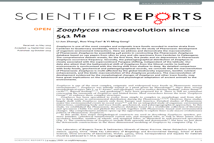 10月9日,自然旗下期刊《科学报告》刊发了我校资源环境学院生物遗迹与成矿过程重点实验室博士张立军和中国地质大学(武汉)教授龚一鸣的国内研究团队在遗迹化石宏演化方面的研究成果,论文题目为《显生宙动藻迹的宏演化》。