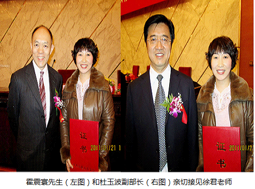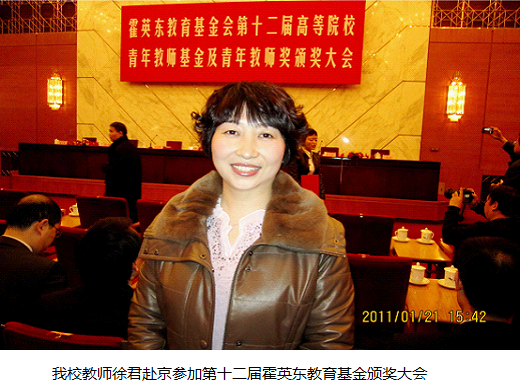 1月21日下午,霍英东教育基金会第十二届高等院校青年教师基金及青年教师奖颁奖大会在人民大会堂举行。来自全国150所高等院校的257名青年教师获得总额为294万美元的资助和奖励。全国政协副主席阿不来提·阿不都热西提,中央统战部副部长尤兰田,教育部副部长杜玉波,科技部副部长陈小娅,国务院港澳办副主任周波,香港中华总商会荣誉会长、霍英东教育基金会理事长霍震寰先生以及国际奥委会委员、香港奥委会主席、霍英东教育基金会副理事长霍震霆先生等出席大会并为获奖教师代表颁奖。我校徐君老师获得青年教师奖三等奖,并作为获奖代表上台领奖。