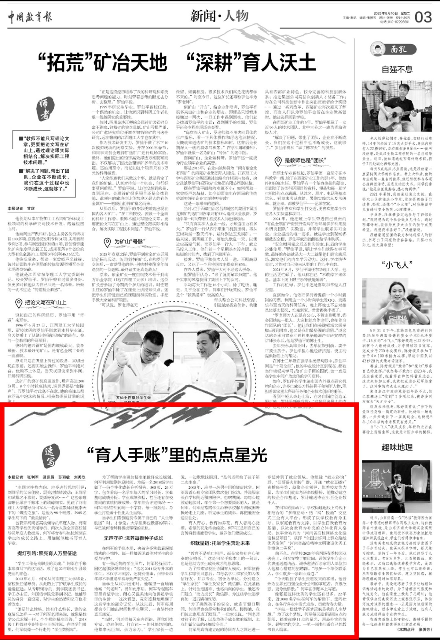 6月10日,《中国教育报》第三版新闻人物专版,以《“育人手账”里的点点星光》为题,宣传报道我校辅导员何军老师22年坚守初心,护航98个班级、2985名学生成长成才的育人故事。自2009年张玉贵老师先进事迹登上《中国教育报》以来,我校教师第二次登上《中国教育报》新闻人物专版,也是学校宣传工作继2024年实现《中国教育报》摄影专版后的又一次突破。