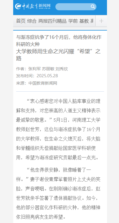 “衷心感谢您对中国人脑库事业的理解和支持,对您崇高的人道主义精神表示最诚挚的敬意。”5月1日,河南理工大学教师赵世芳,这位与渐冻症抗争了16个月的大学教师,在生命之火熄灭后,将大脑和脊髓组织无偿捐献给国家医学科研使用,希望为渐冻症研究贡献最后一点光。