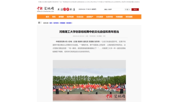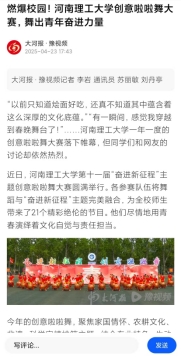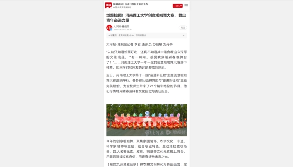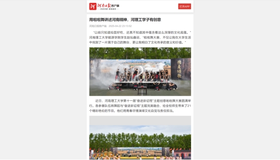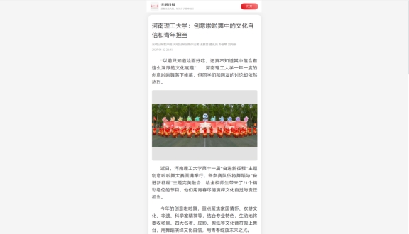近日,学校第十一届“奋进新征程”主题创意啦啦舞大赛圆满举行。各参赛队伍将舞蹈与“奋进新征程”主题完美融合,给全校师生带来了21个精彩绝伦的节目。连日来,光明日报、中国青年报、河南日报、大河报等主流媒体宣传报道学校创意啦啦舞里的文化自信和青年担当。具体内容如下: