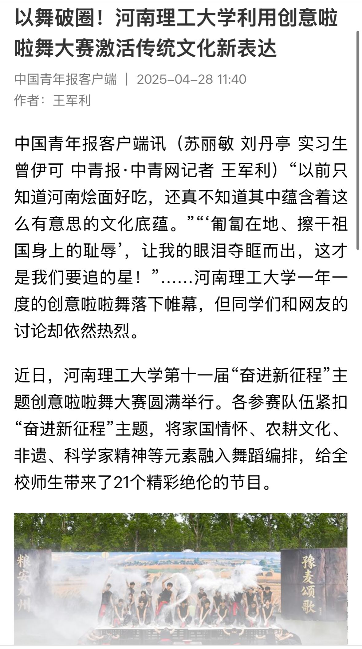 “以前只知道烩面好吃,还真不知道其中蕴含着这么深厚的文化底蕴”……河南理工大学一年一度的创意啦啦舞落下帷幕,但同学们和网友的讨论却依然热烈。