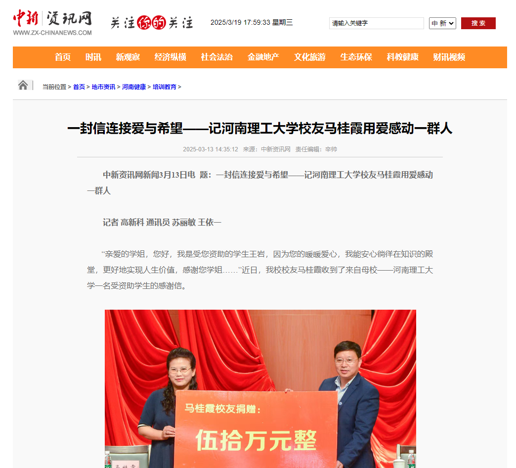 3月1日,《中国教育报》第二版要闻,以《15年,500名学弟学妹接受资助 “亲爱的学姐,您好……”》为题,宣传报道学校1982级校友马桂霞捐资助学,用大爱温暖母校学子的典型事迹。具体内容如下: