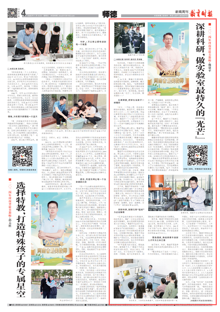近日,《教育时报》以《深耕科研,做实验室最持久的“光芒”》为题并配发图片,宣传报告学校安全学院院长、2024年河南省最美教师魏建平,近30年来,扎根课堂,培养国家所需栋梁;深耕科研,解决国家战略之需的典型事迹。相关内容如下:
