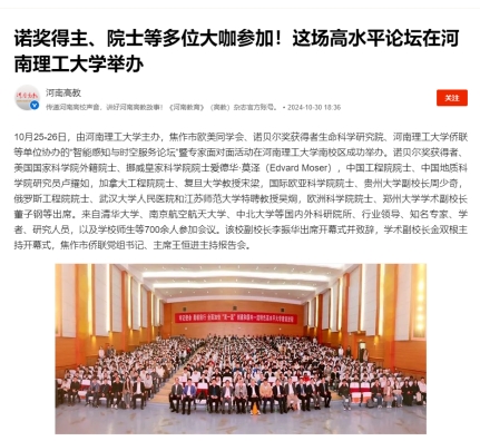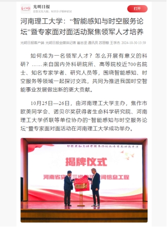10月25日—26日,由河南理工大学主办,焦作市欧美同学会、诺贝尔奖获得者生命科学研究院、河南理工大学侨联等单位协办的“智能感知与时空服务论坛”暨专家面对面活动在河南理工大学成功举办。连日来,光明日报客户端、人民网、河南日报客户端等13家媒体报道。相关内容如下: