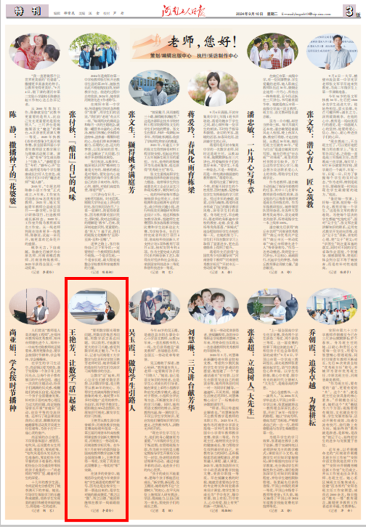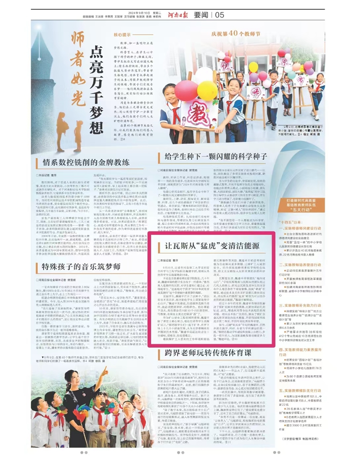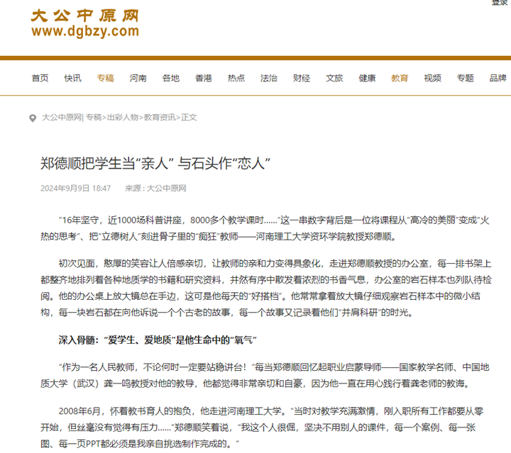 9月10日,《河南日报》《河南工人日报》等主流媒体,聚焦“大力弘扬教育家精神,加快建设教育强国”,宣传报道学校安全学院教授魏建平、资环学院教授郑德顺、数信学院副教授王艳芳先进事迹,他们用实际行动践行“严慈严谨严格”的教风,用无私奉献的育人精神,照亮了莘莘学子的前行之路。相关内容如下: