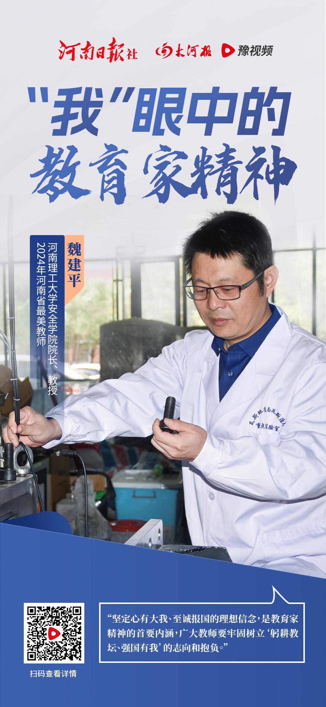不论是当普通老师还是学院院长,几十年来,魏建平始终把学生当孩子一样看待。“教书育人是教师的天职,对学生要有仁爱之心、对得起学生。”这是他对于获评“2024年河南省最美教师”这个荣誉最朴素真挚的理解。