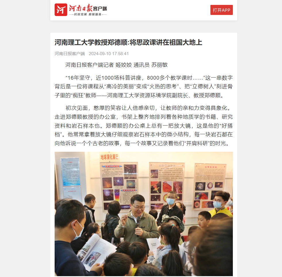 热爱不是冲动,作为河南省首席科普专家,郑德顺还组建了河南理工大学大学生地学探秘协会。他每年都带领团队结合科普对象的年龄和特点,运用不同的科普方式,面向校内外开展科普教育近1000场次,该协会被评为“中国煤炭学会科普教育社团”“河南省十佳社团”等。