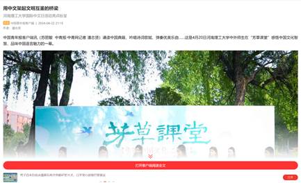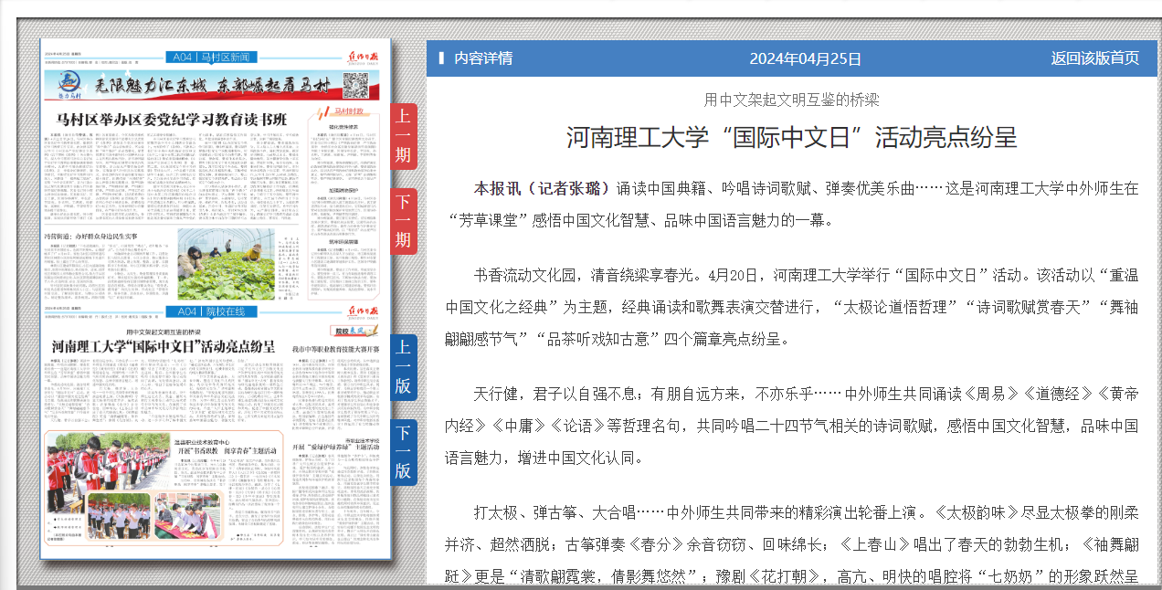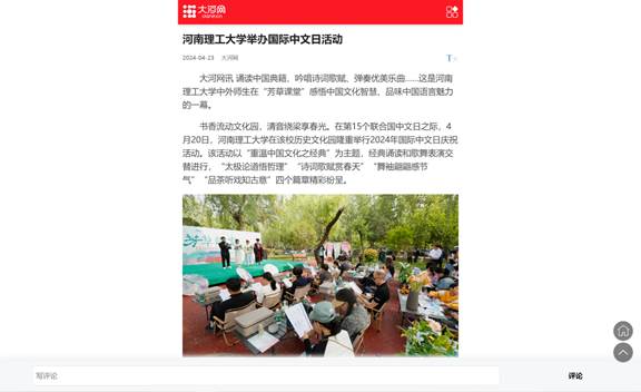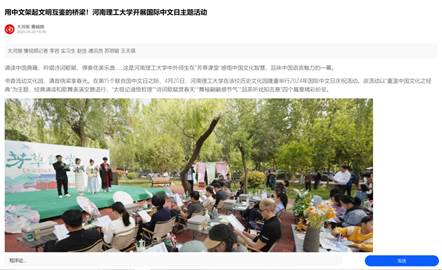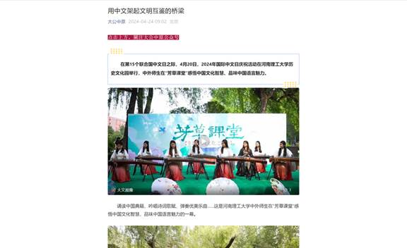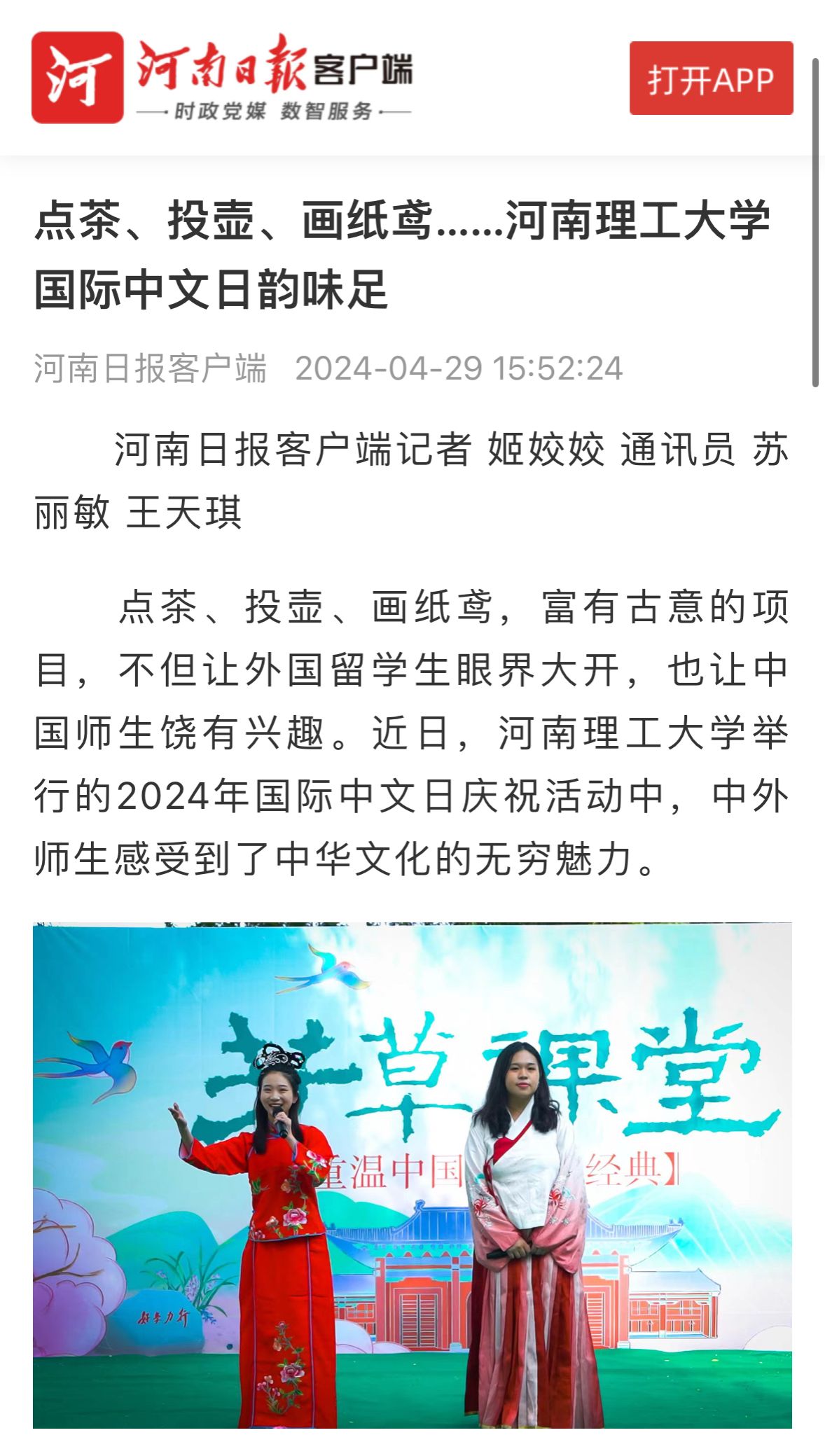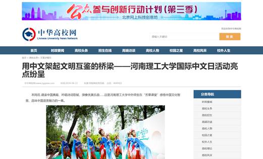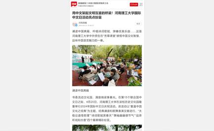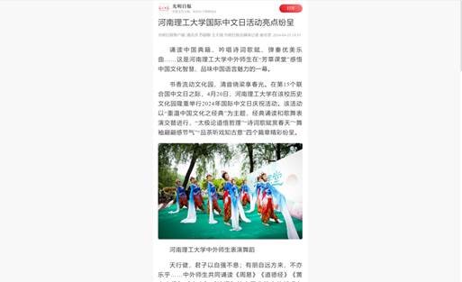 4月20日,河南理工大学在该校历史文化园隆重举行2024年国际中文日活动。连日来,光明日报、中国青年报、人民日报、河南日报等13家主流媒体进行了报道,引发热烈反响。具体内容如下: